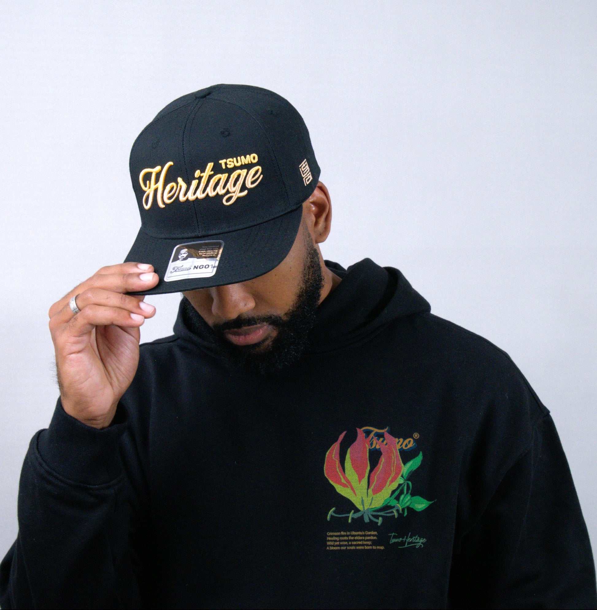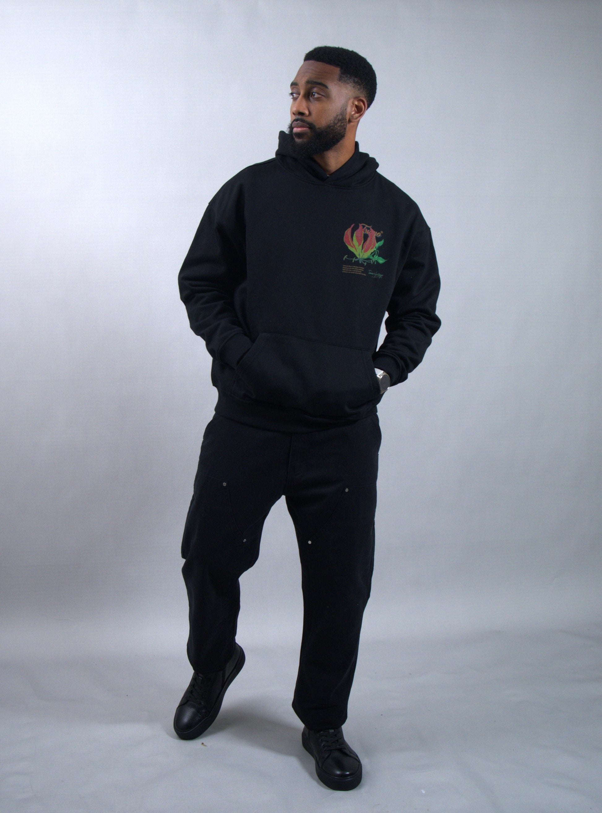 Built with a durable cotton-polyester blend, this stringless hoodie combines lasting style with practical functionality. The fabric resists deformation while preserving breathability throughout wear. A prominent flame lily flower illustration adorns the back, rendered with precision to harmonise with the garment's weave. The front showcases a proportionally scaled version of the same motif, establishing visual equilibrium across the piece.